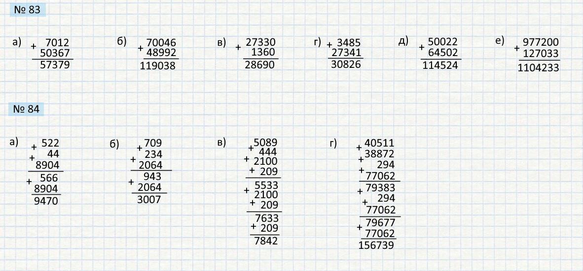 83. Вычислите: а) 7 012 + 50 367; 6) 70 046 + 48 992; в) 27 330 +1 360; r) 3 485 + 27 341; A) 50 022 + 64 502; е) 977 200 + 127 033. 84. Найдите сумму чисел: а) 522, 44, 8 904; 6) 709, 234, 2 064; c) 40 511.38 872. 294. 77 062. пж срочно