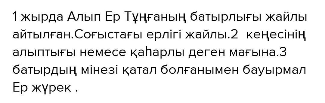 2-тапсырма. Сұрақтарға жауап беріп, тапсырмаларды орындаңдар. 1. «Алып Ер Тұңға» жырында не баяндалады? 2. Тұран әскері қолбасшысының атына қосылып айтылатын салып» сөзі қандай мағынаны білдірген? 3. Алып Ер Тұңғаға мінездеме беріңдер. 4. Берілген мәліметті негізге ала отырып, бүгінгі күні онда кімдер тұратынын картадан көрсетіңдер. «Тұран» Тур елі туркілер елі деген сөз. Иран патшалары мен Афрасиабтың соғысы Сейхун (Сырдария) — Жейхун (Әмудария) шега- расында болған. Бchen 20 баллов норм ответ на все