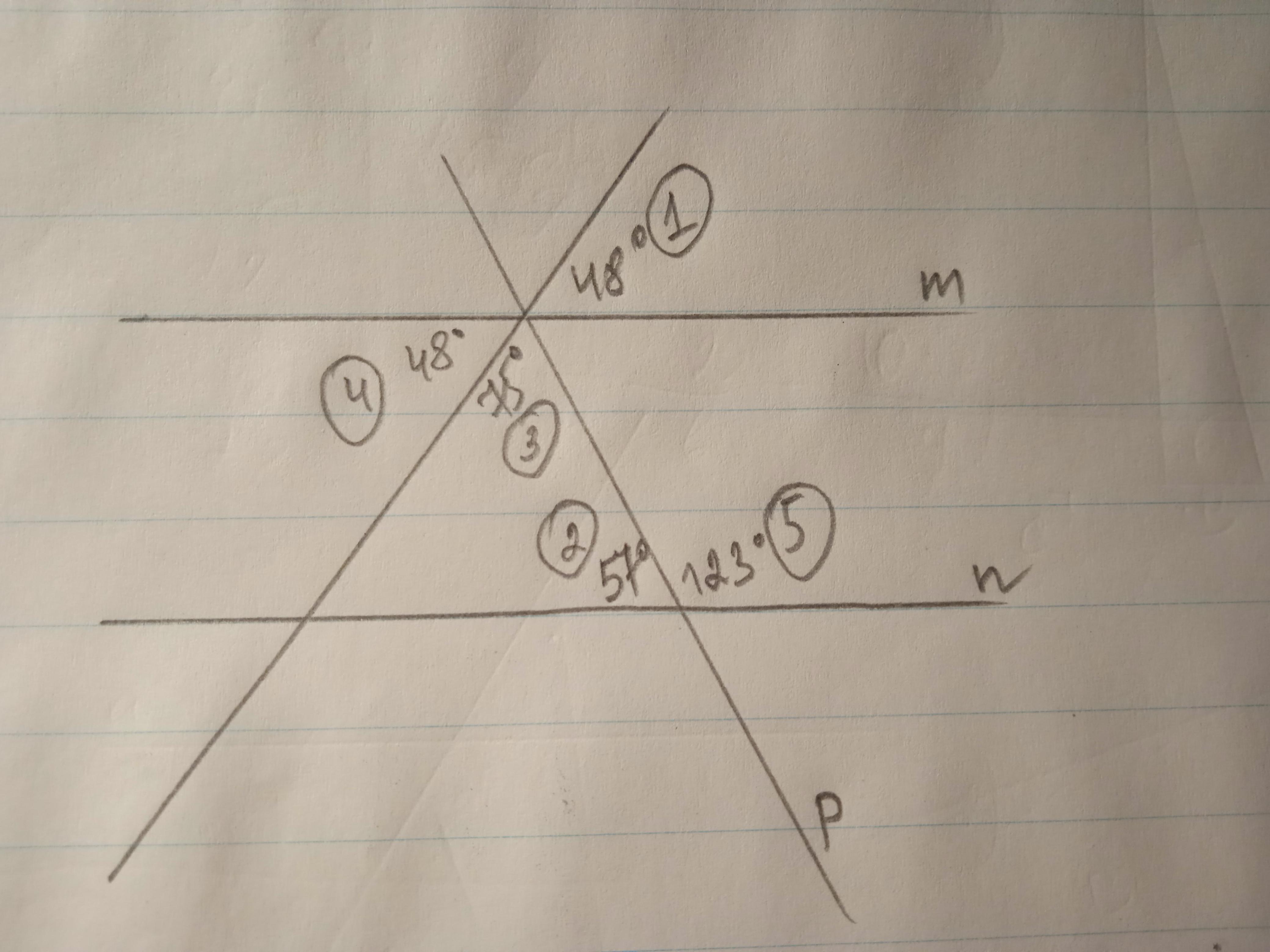 ∠3+∠4=∠5=123° как внутренние накрест лежащие при m║n и секущей р