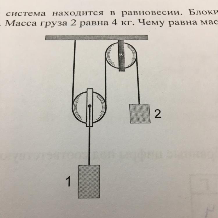 изображенная на рисунке система находится в равновесии блоки и нить очень легкие трение пренебрижимо мало.масса груза 2 равна 4 кг чему равна масса 1