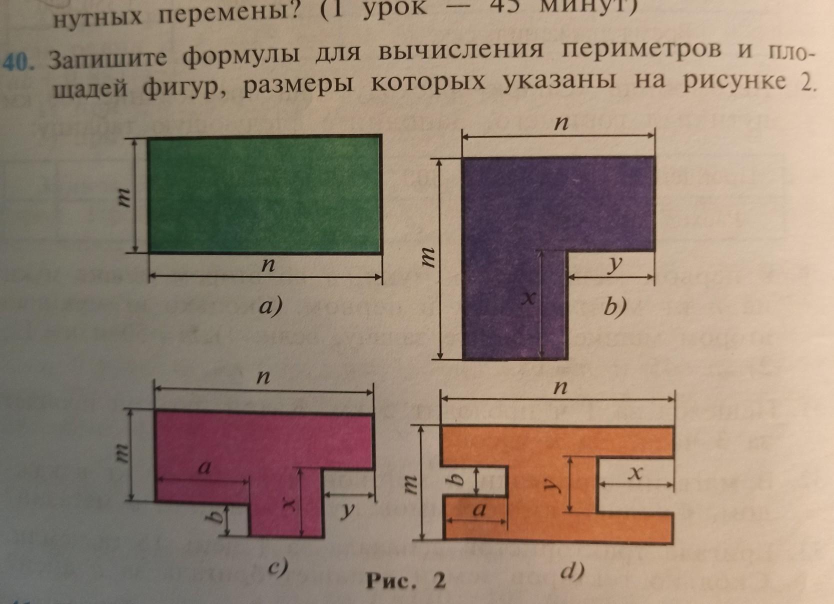 Запишите формулу для вычисления периметров и площади фигуры размеры которого указаны на рисунке 2