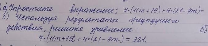 упростите вырожение: 7×(11m+19)+4×(21-9m)=