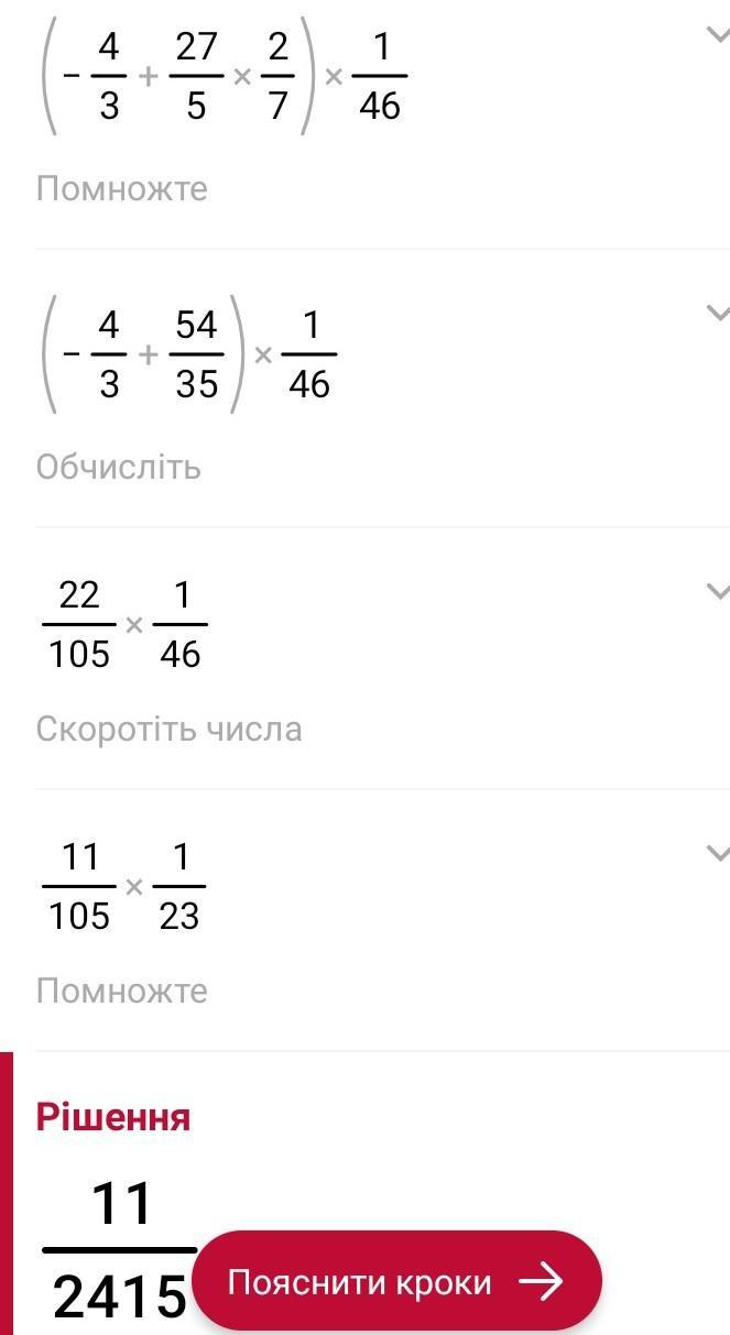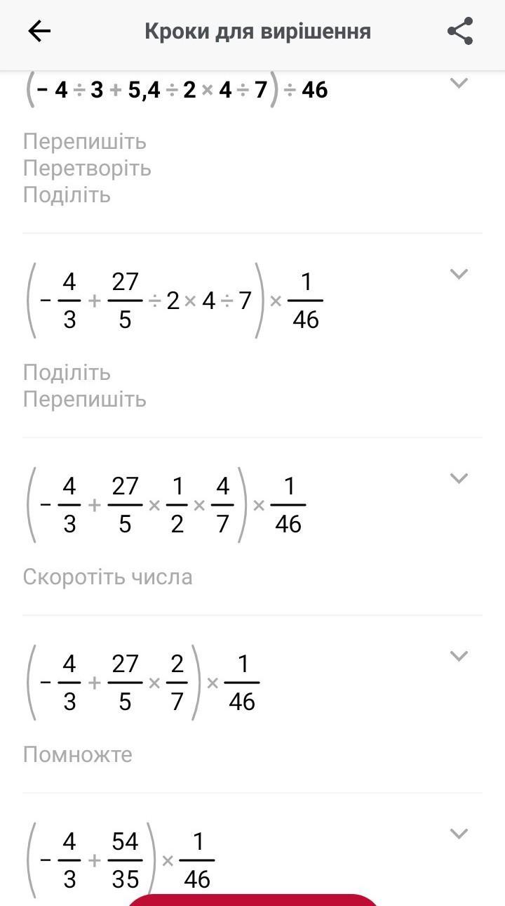 вычислите (-4/3+5,4:2 4/7):46 запишите полностью решение и ответ ответ представте в виде обыкновенной несократимой дроби