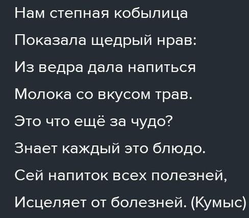 тгадай загадку о национальном напитке. Сп яя знаки препинания в конце предложений Нам степная кобылица Показала щедрый нрав: Из ведра дала напиться Молока со вкусом трав (....) Это что ещё за чудо (...) Знает каждый это блюдо (...) Сей напиток всех полезней, Исцеляет от болезней (...) уко-буквенный анализ Слова-отгалки