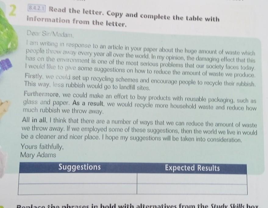 8.4.2.1 Read the letter. Copy and complete the table with nformation from the letter.
