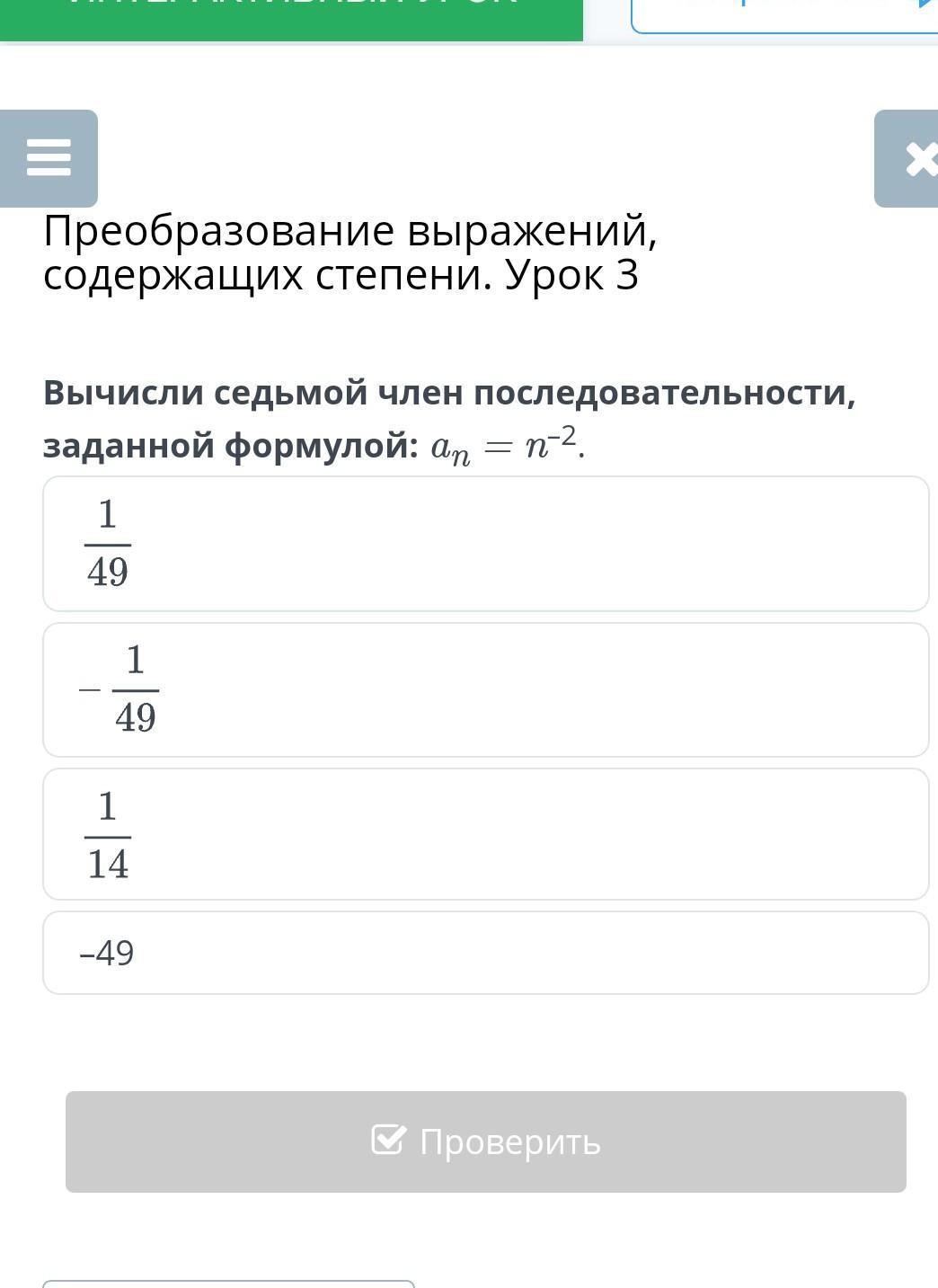 Вычисли седьмой член последовательности, заданной формулой: an = n–2.