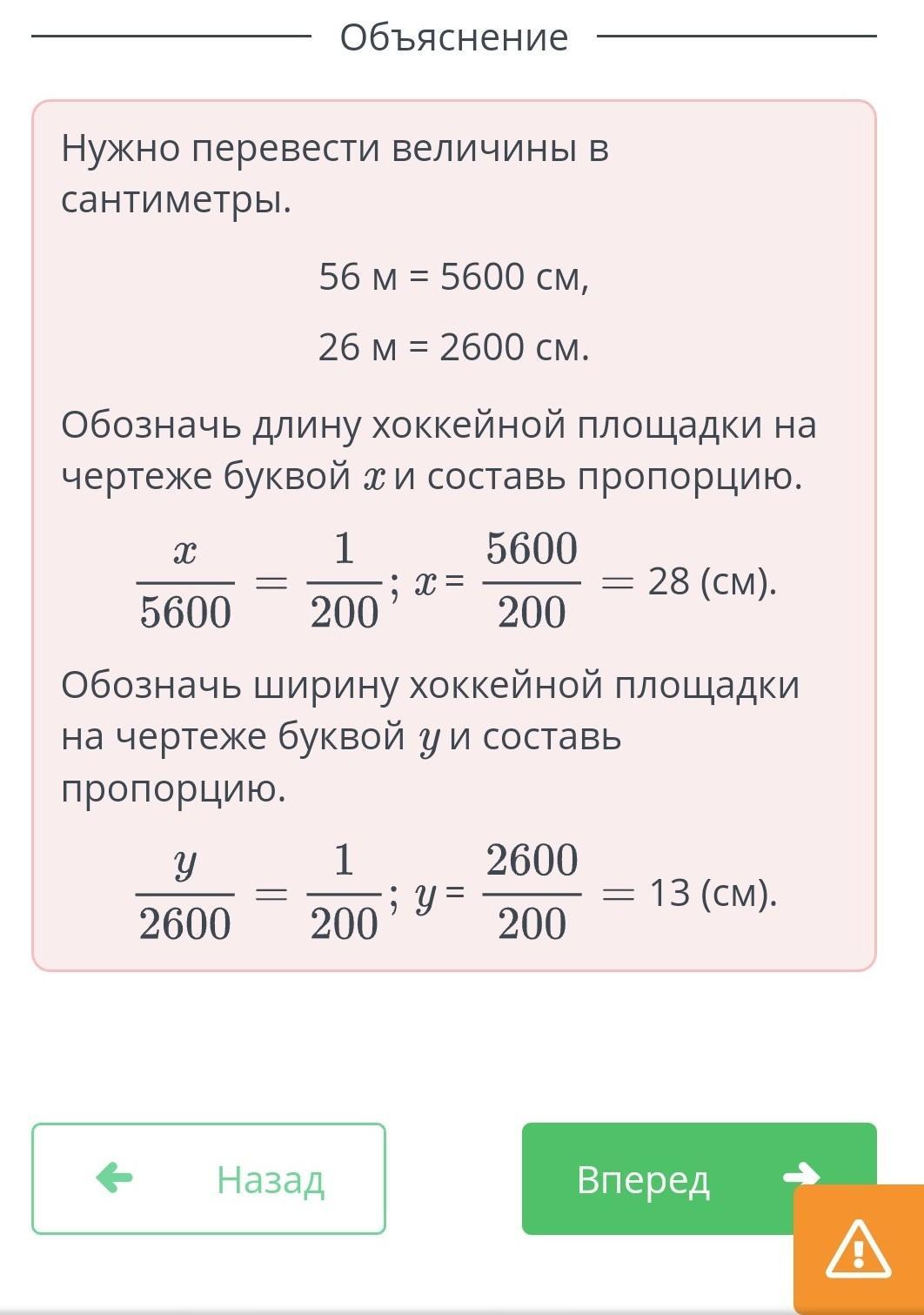 Длина хоккейной площадки равна 56 м, ширина – 26м. Найди длину и ширину площадки на чертеже в масштабе 1:200.