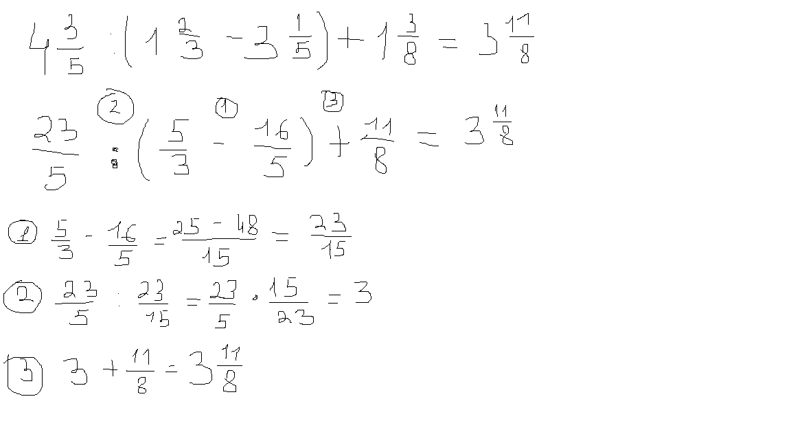Вычислите:Четыре целых три пятых : на (одну целую две третьих - три целых одна пятая)+одна целая три восьмых