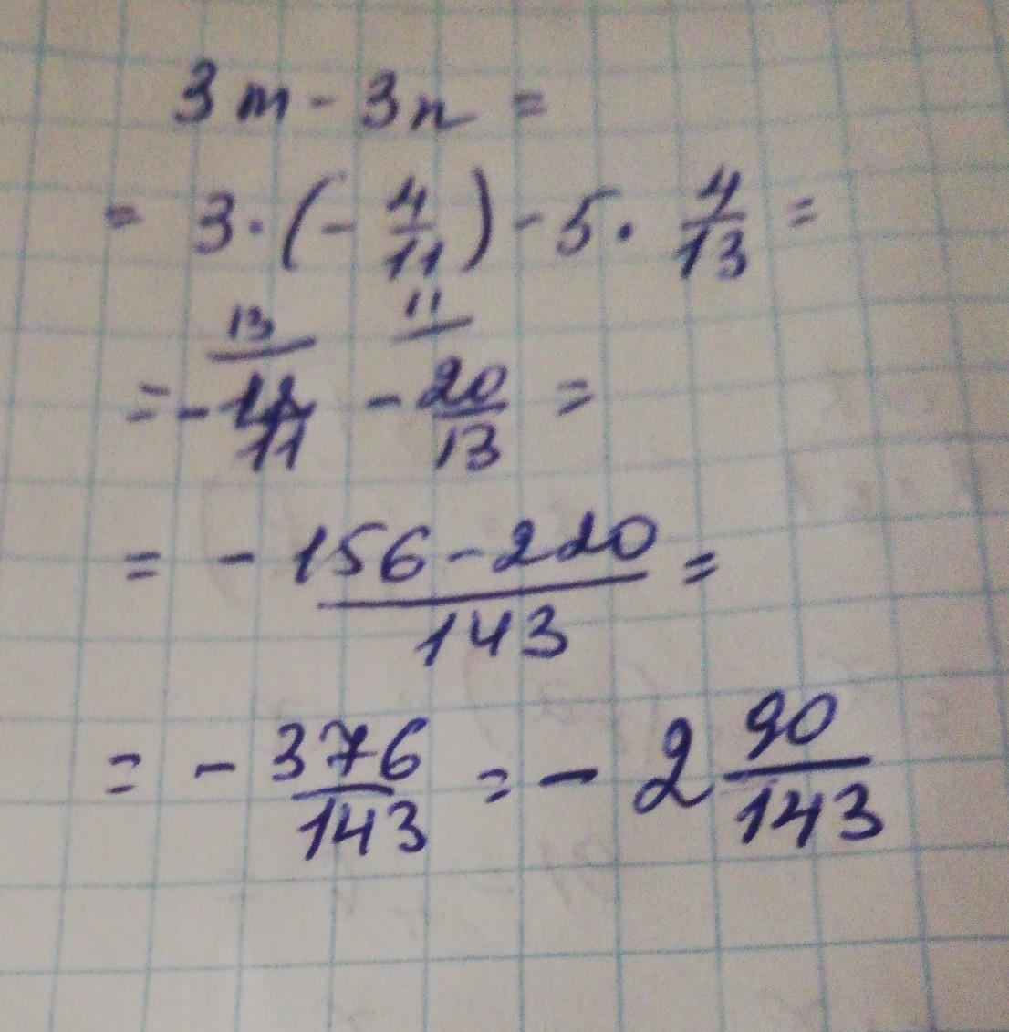 Найди значение выражения 3m−5n, если m=−4/11, а n=4/13.