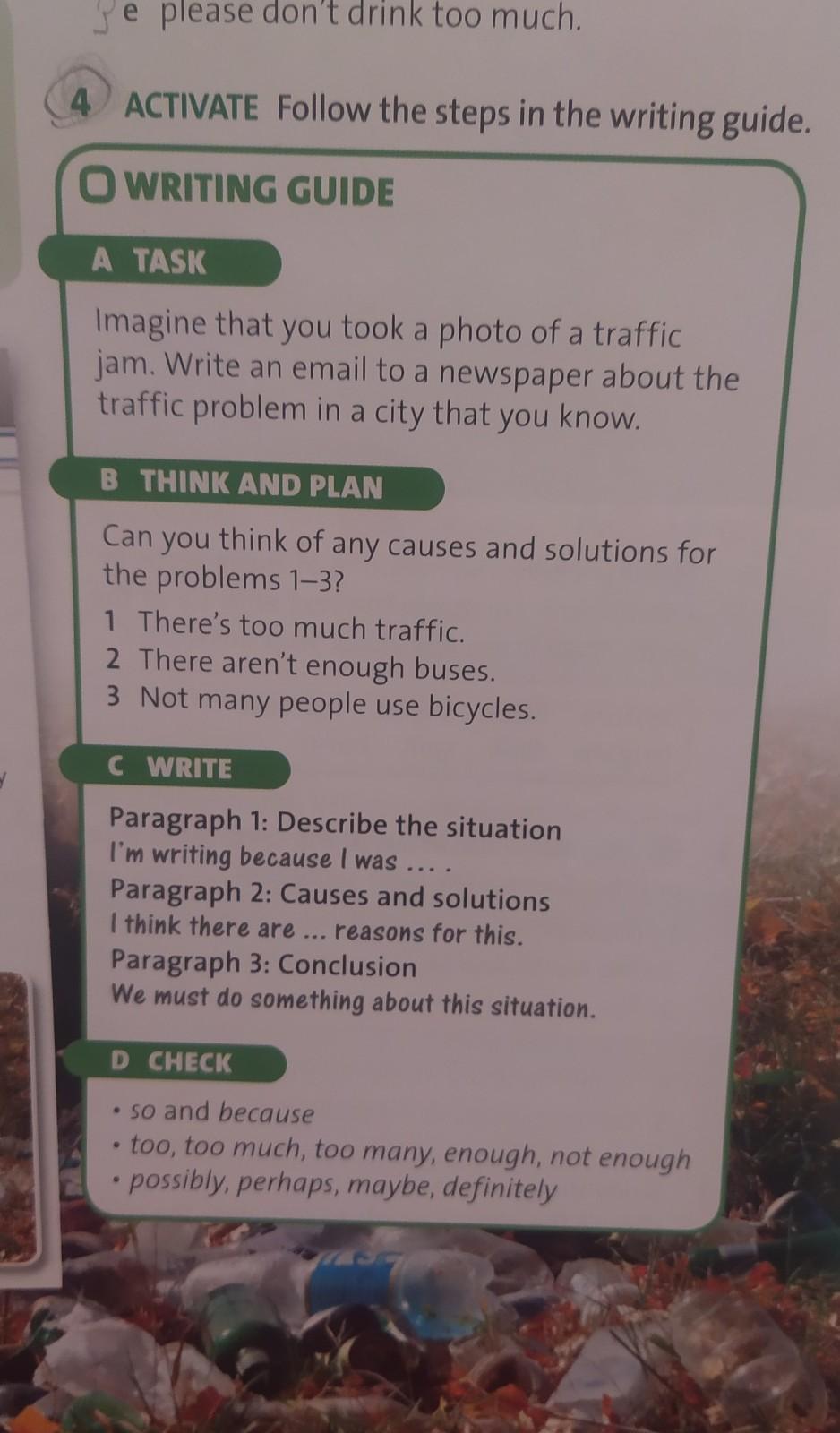 4 ACTIVATE Follow the steps in the writing guide. WRITING GUIDE A TASK Imagine that you took a photo of a traffic jam. Write an email to a newspaper about the traffic problem in a city that you know. B THINK AND PLAN Can you think of any causes and solutions for the problems 1–3? 1 There's too much traffic. 2 There aren't enough buses. 3 Not many people use bicycles. C WRITE Paragraph 1: Describe the situation I'm writing because I was .... Paragraph 2: Causes and solutions I think there are ... reasons for this. Paragraph 3: Conclusion We must do something about this situation. D CHECK • so and because • too, too much, too many, enough, not enough • possibly, perhaps, maybe, definitely 7