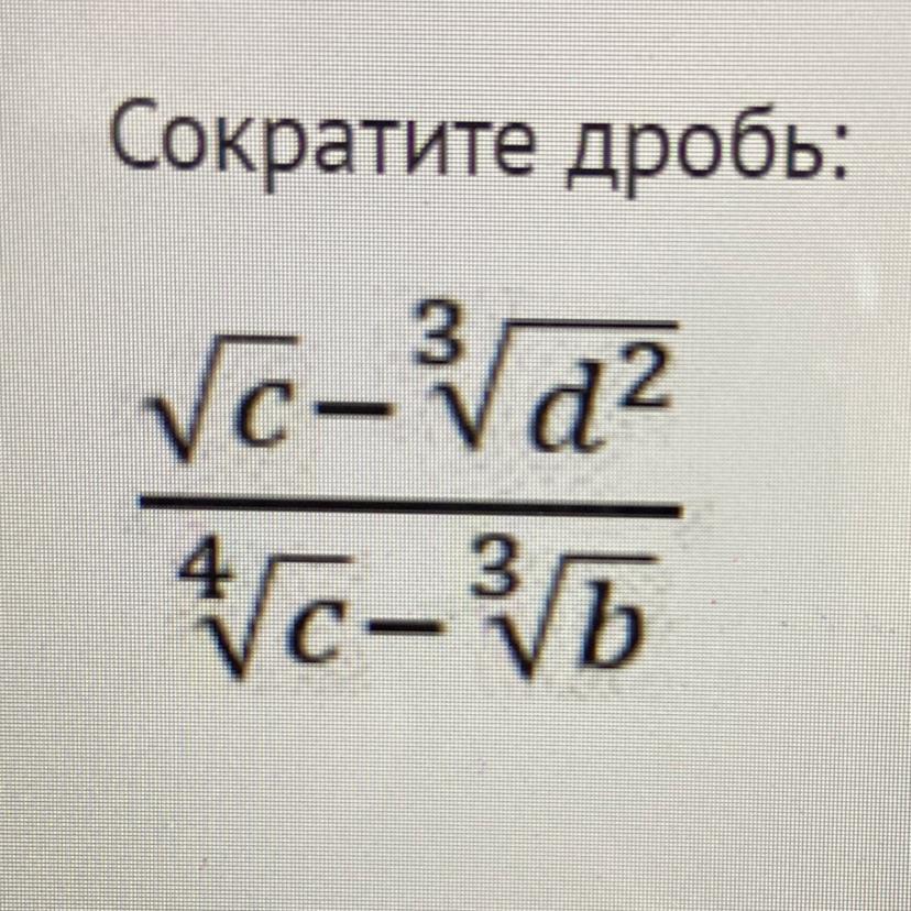 \dfrac{\sqrt{c}-\sqrt[3]{d^2}}{\sqrt[4]{c}-\sqrt[3]{d}}=\dfrac{(\sqrt[4]{c}-\sqrt[3]{d})(\sqrt[4]{c}+\sqrt[3]{d})}{\sqrt[4]{c}-\sqrt[3]{d}}=\sqrt[4]{c}+\sqrt[3]{d}