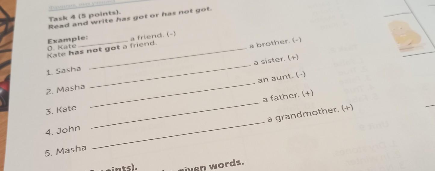 Task 4 (5 points). Read and write has got or has not got. Example: 0. Kate a friend. (-) Kate has not got a friend. a brother. (-) 1. Sasha a sister. (+) 2. Masha an aunt. (-) 3. Kate a father. (+) 4. John a grandmother. (+) 5. Masha