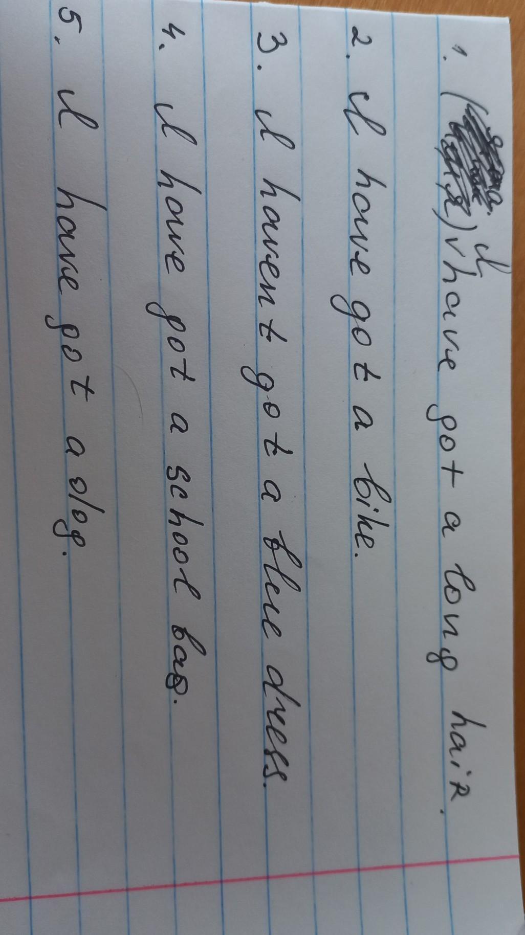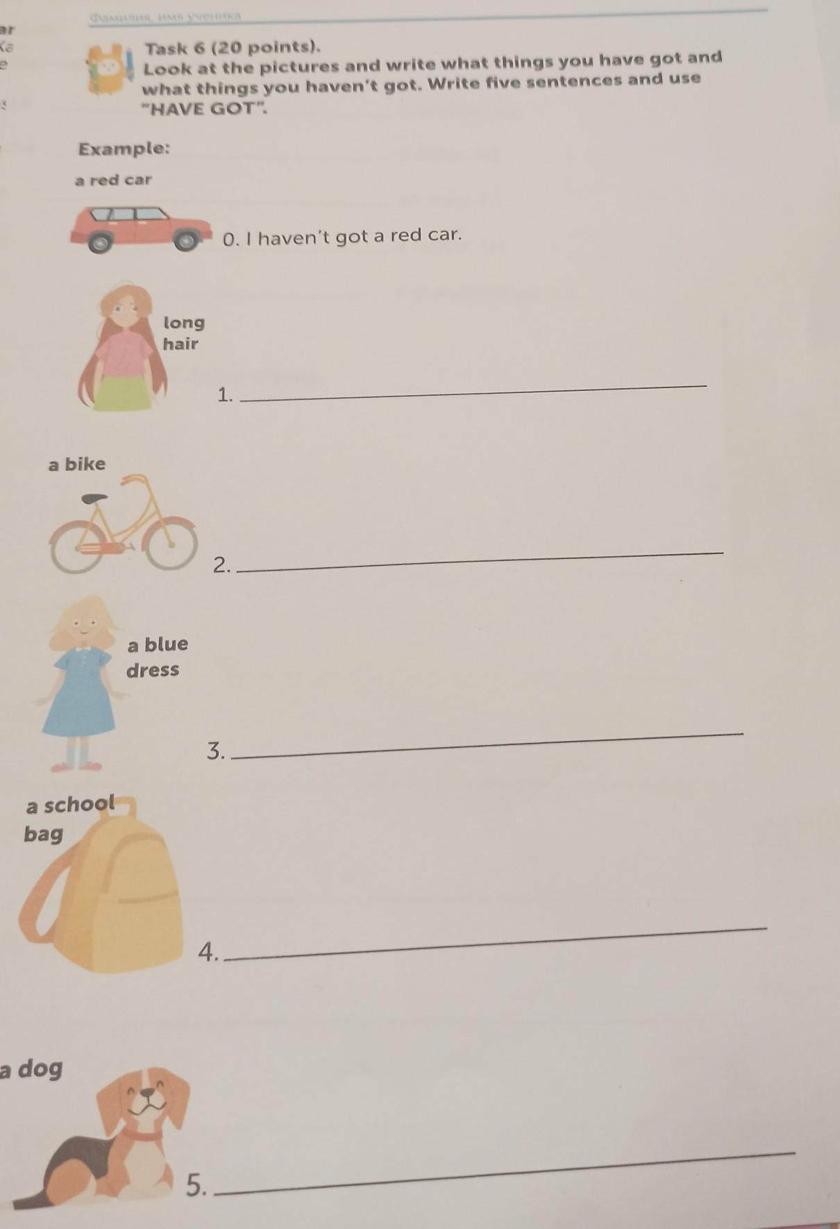 Task 5 (15 points), Make questions from the given words. Example: 0. Sue a big got house has? Has Sue got a big house? 1. she got has a school bag? 2. got a dog Masha has? 3. John got three has cats? 4. Kate a got has doll? 5. bike has a Sasha got?