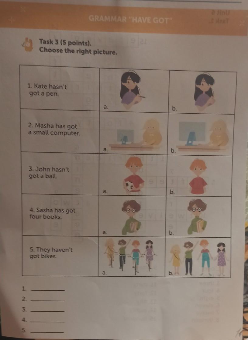 Task 3 (5 points). Choose the right picture. 1 Kate hasn't got a pen a. b. 2. Masha has got a small computer. a. b. 3. John hasn't got a ball a. b. oo 4. Sasha has got four books. a. b. 5. They haven't got bikes a. b. 1 2. 3 4 Task (10A Look a Sash Example: 5