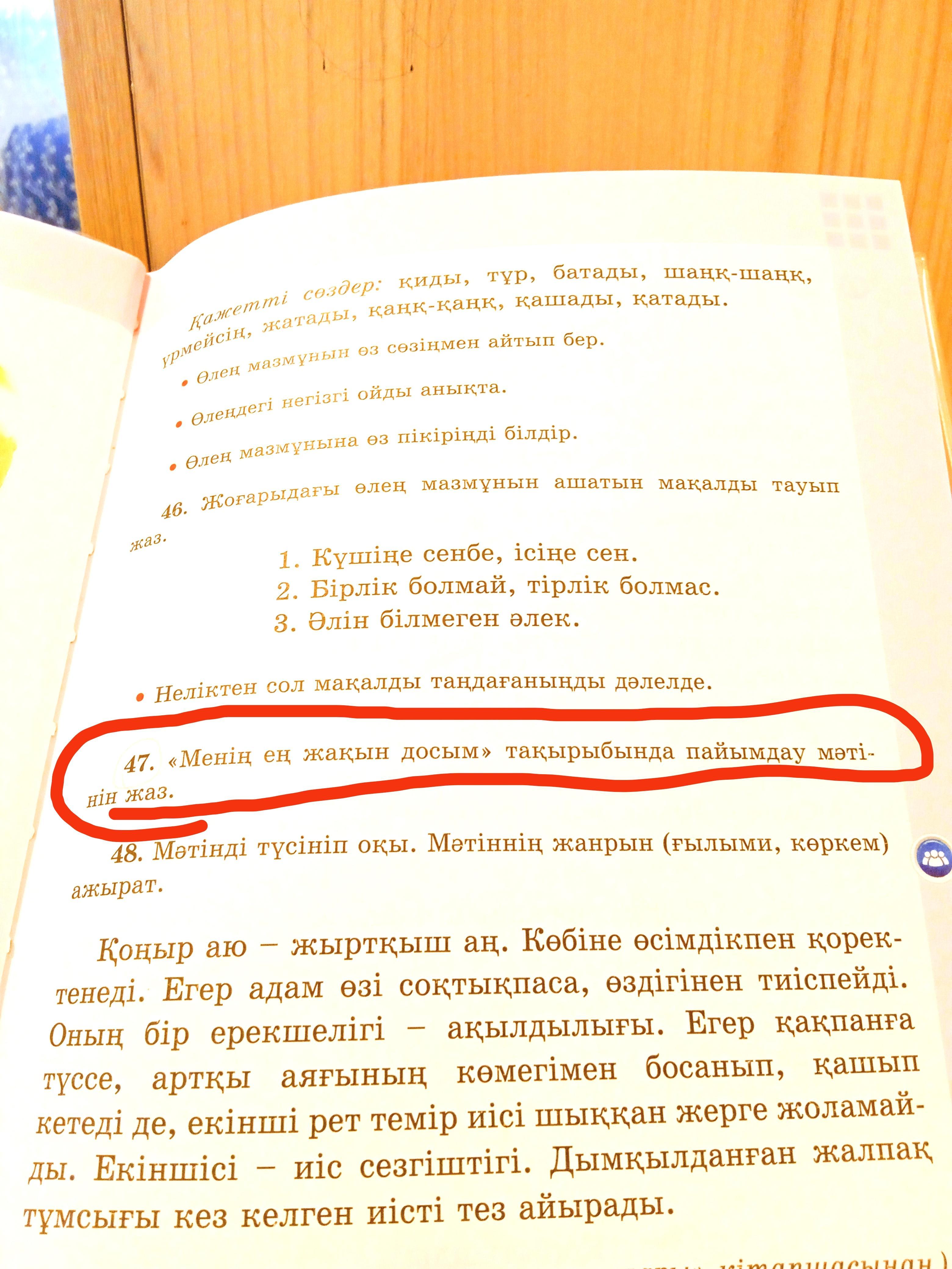 Менің ең жақын досым бар . Мен оны жақсы көремін . Себебі ол өте сақ , мейірімді , ақылды . Біз екеуіміз әрқашан дос болавереміз
