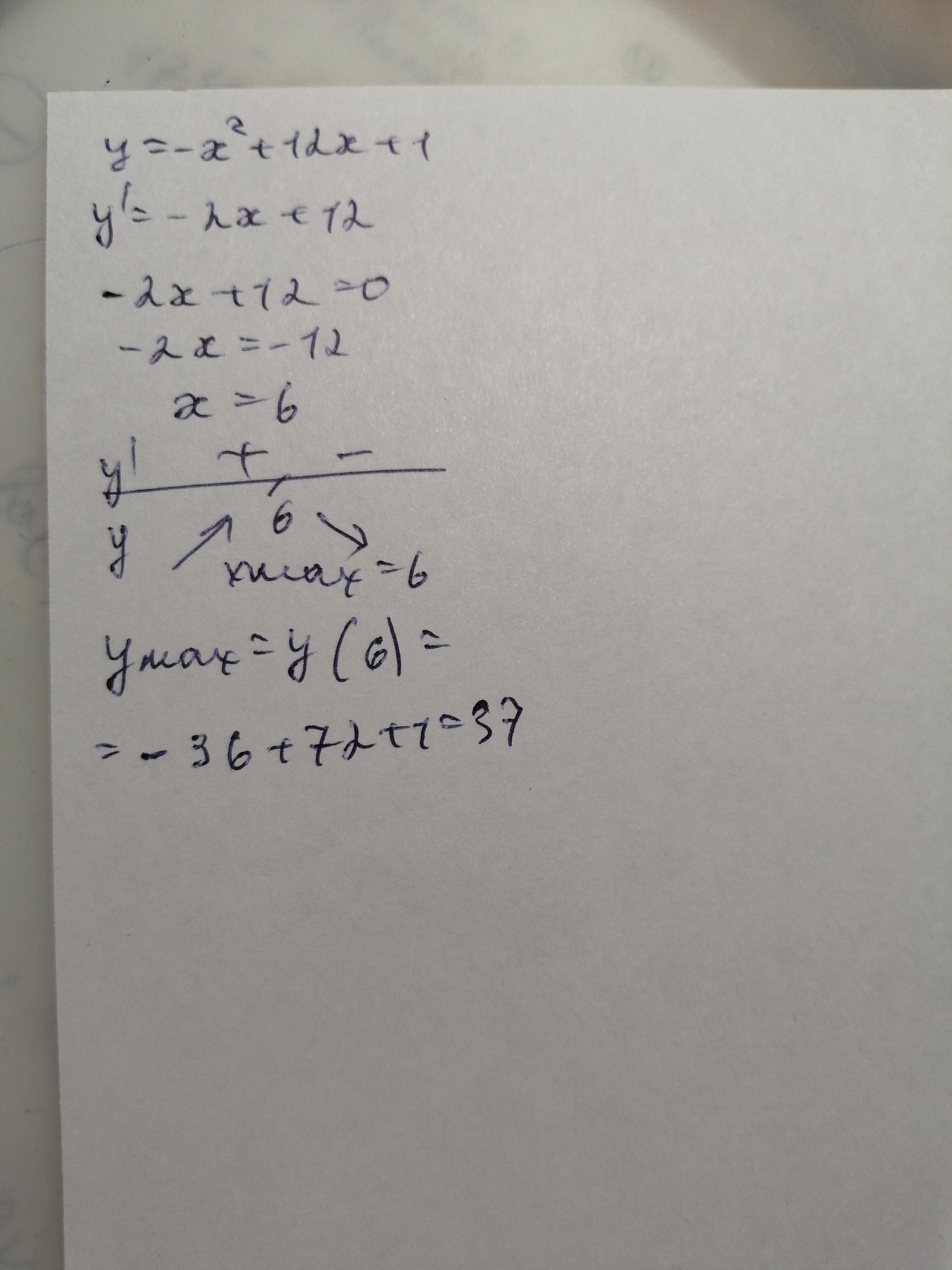 Ответ: наибольшее значение в вершине параболы хв=-12/(-2)=6, умакс=-36+72+1=36+1=37.