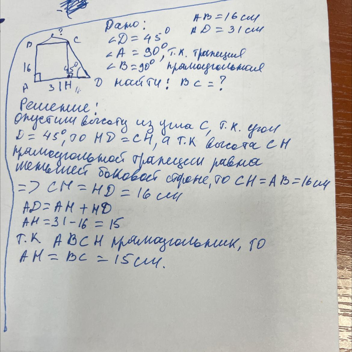 Высота СН опущенная из тупого угла, делит трапецию на прямоугольник и треугольник