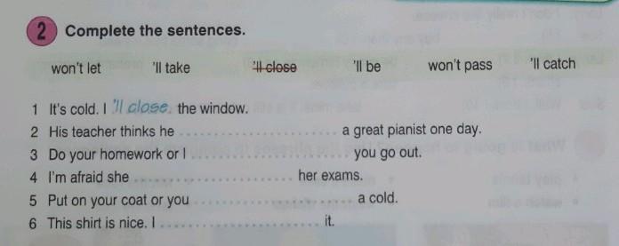 2 Complete the sentences. won't let 'll take close 'll be won't pass 'll catch 1 It's cold. I'll close the window. 2 His teacher thinks he a great pianist one day. 3 Do your homework or 1. you go out. 4 I'm afraid she 5 Put on your coat or you her exams. a cold. 6 This shirt is nice. I it.