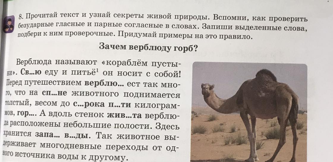 Одно из специфических приспособлений верблюда для жизни в пустыне — горбы, представляющие собой жировые отложения. Горбы служат своеобразной «крышей», защищающей спину верблюда от палящего солнца. Кроме того, концентрация всех жировых запасов организма на спине способствует лучшей теплоотдаче.