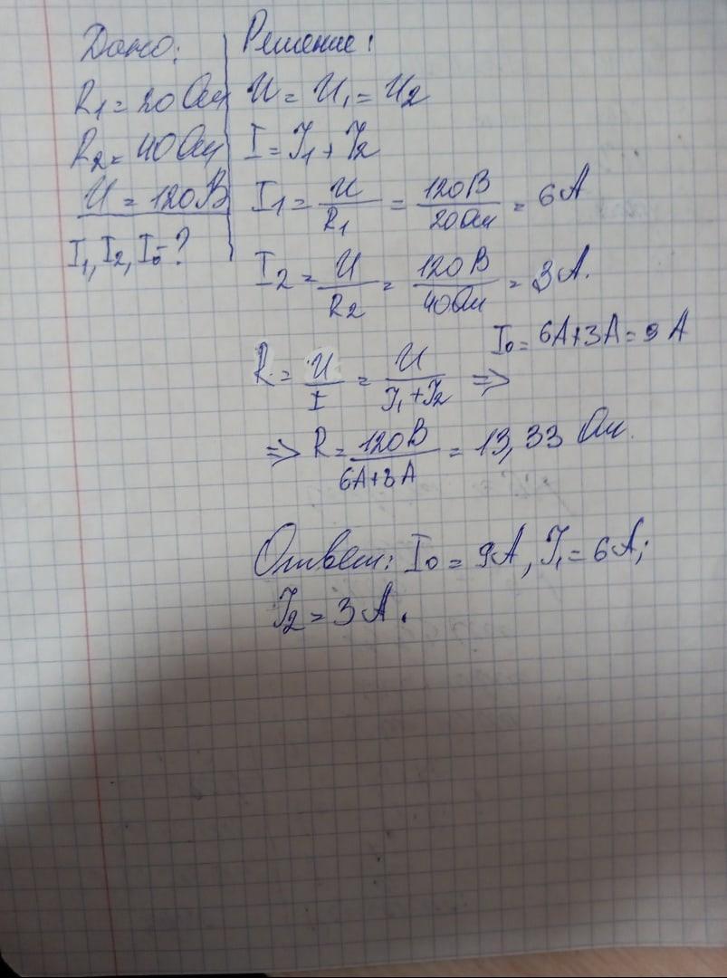 Два провідника опором 20ом і 40ом включені паралельно. Визначити силу струму в колі та силу струму , що проходить через кожних опорів рри напрузі 120в