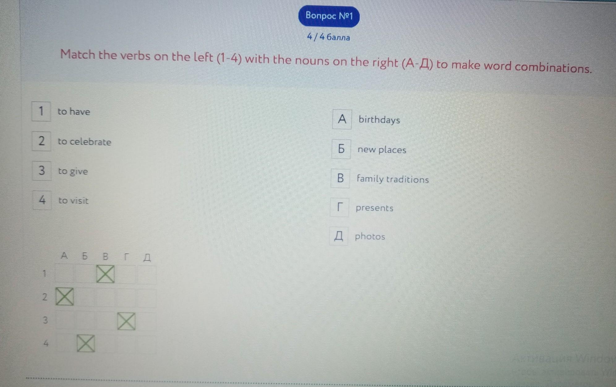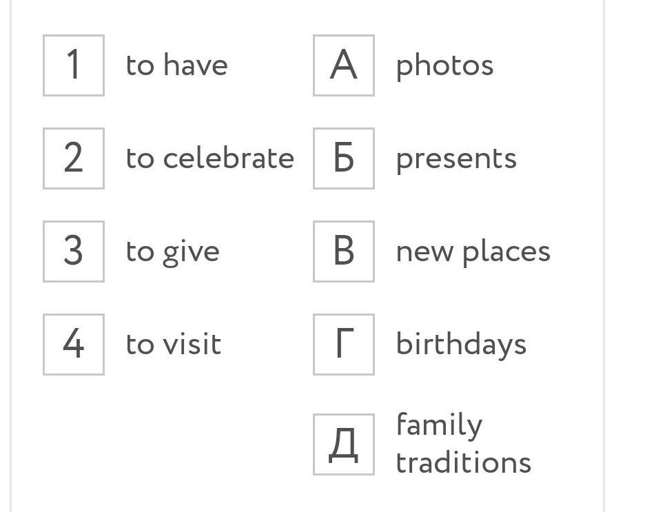 Сопоставьте глаголы слева (1–4) с существительными справа (A – Д), чтобы образовать словосочетания.