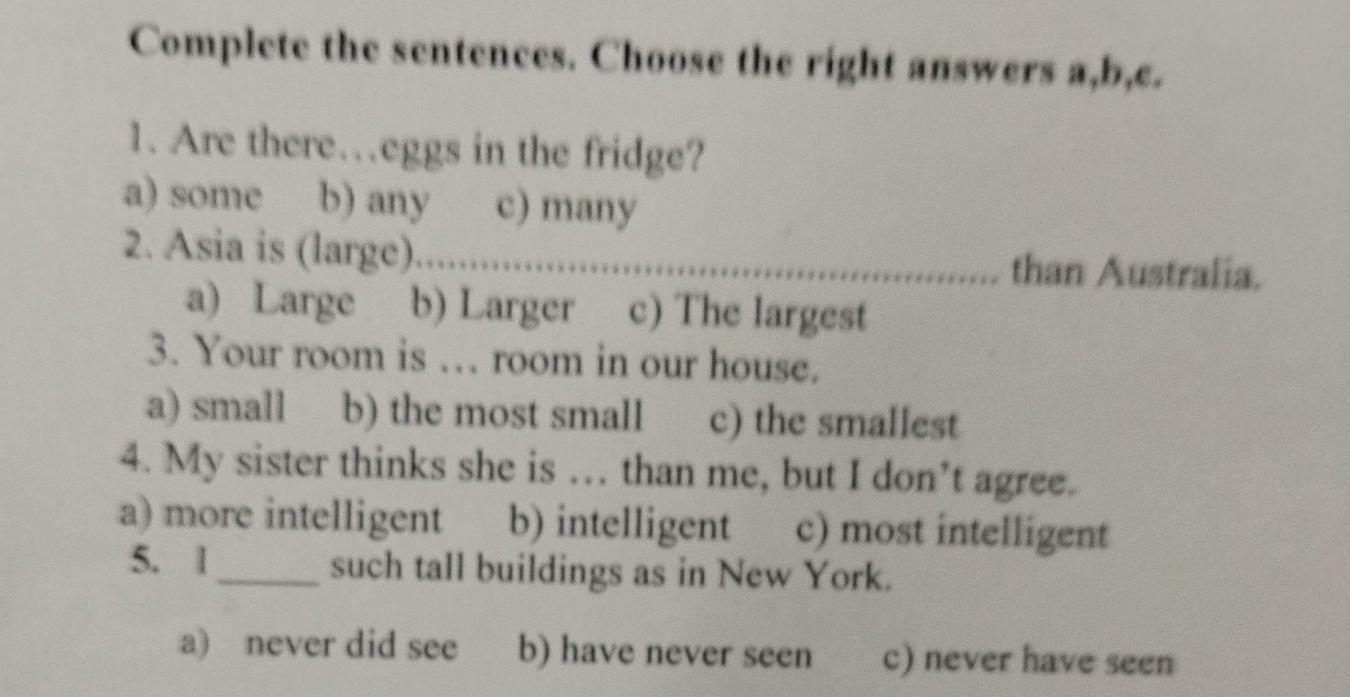 срочноооо́ооооооооооо помогите Complete the sentences. Choose the right answers a,b,e. 1. Are there...eggs in the fridge? a) some b) any c) many 2. Asia is (large)............. than Aus a) Large b) Larger c) The largest 3. Your room is ... room in our house. a) small b) the most small c) the smallest 4. My sister thinks she is ... than me, but I don't agree. a) more intelligent b) intelligent c) most intelligent 5. I such tall buildings as in New York. anever did see b) have never seen c) never have see
