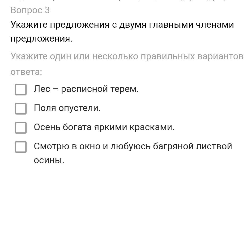 Укажите предложения с двумя главными членами предложения. Укажите один или несколько правильных вариантов ответа: Леc – расписной терем. Поля опустели. Осень богата яркими красками. Смотрю в окно и любуюсь багряной листвой осины.