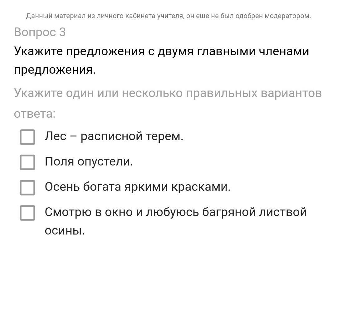 Укажите предложения с двумя главными членами предложения. Укажите один или несколько правильных вариантов ответа: Леc – расписной терем. Поля опустели. Осень богата яркими красками. Смотрю в окно и любуюсь багряной листвой осины.