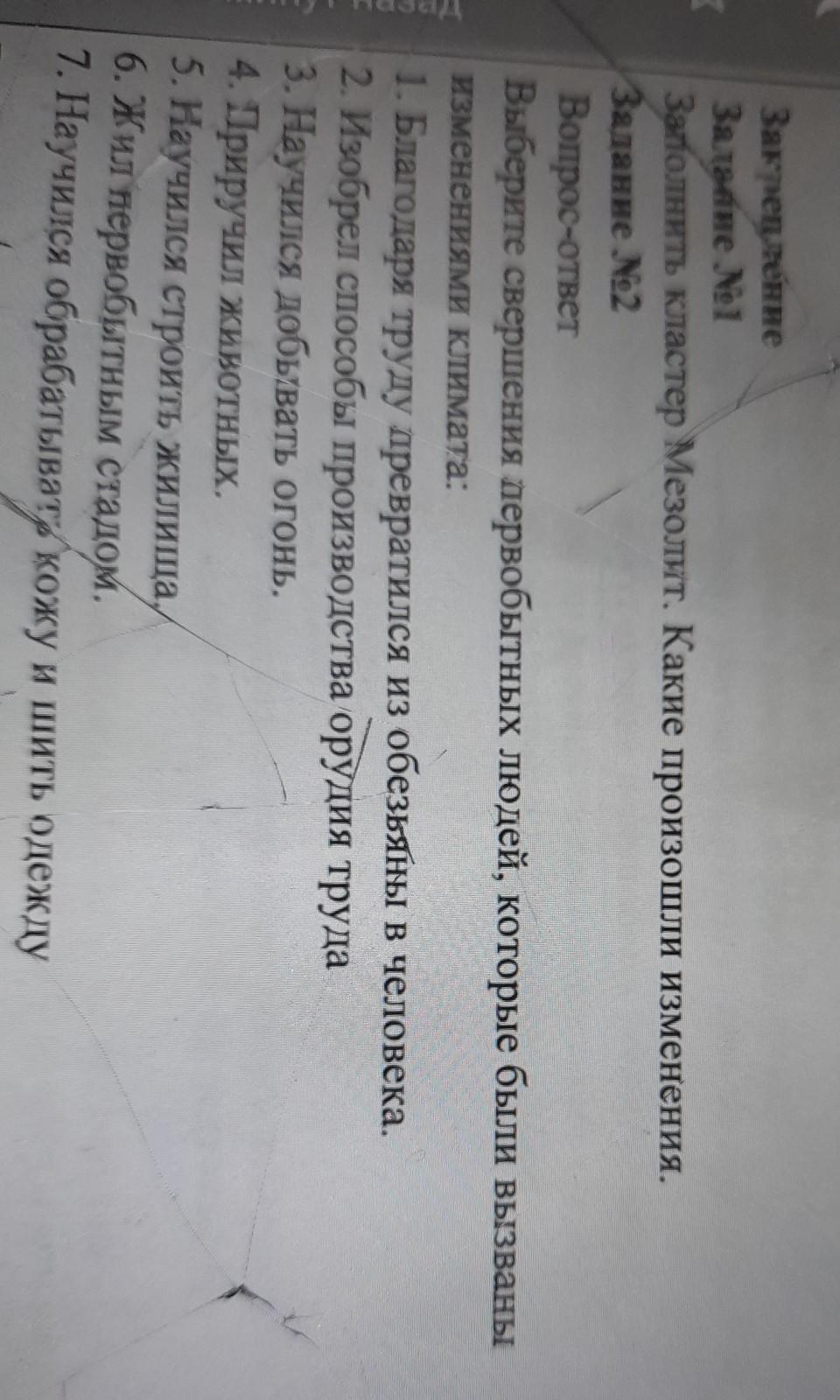 Закрепление Задание № 1 Заболнить кластер Мезолит. Какие произошли изменения Задание №2 Вопрос-ответ Выберите свершения первобытных людей, которые были вызваны изменениями климата: 1. Благодаря труду превратился из обезьяны в человека. 2. Изобрел способы производства орудия труда 3. Научился добывать огонь. 4. Приручил животных. 5. Научился строить жилища, 6. Жил первобытным стадом. 7. Научился обрабатывата кожу и шить одежду