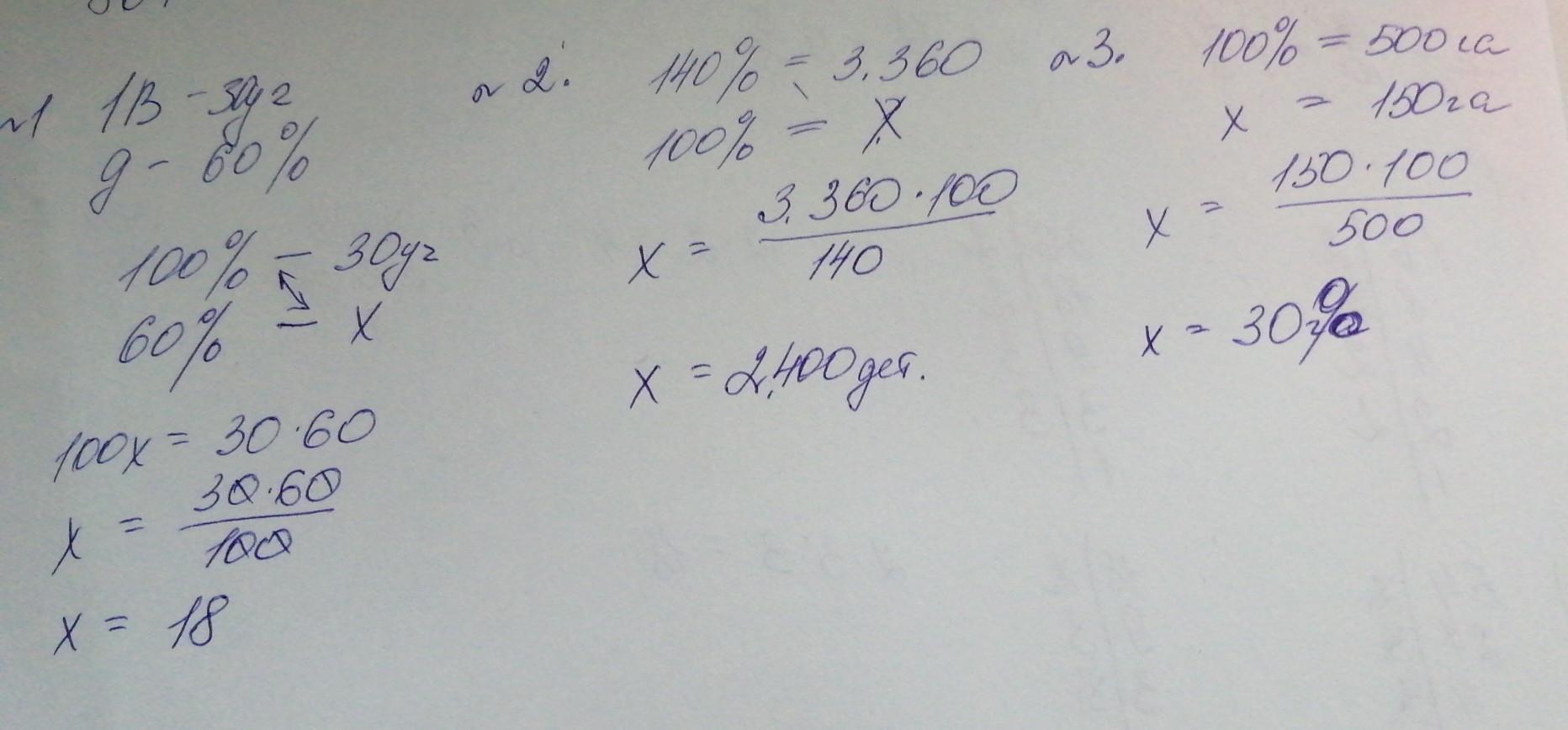 Решите задачи на проценты способом пропорции: 1.В классе 30 учащихся. Девочки составляют 60% от всех учащихся класса. Сколько девочек в классе? 2.Завод за месяц выпустил 3360 машин, что составило 140% его месячного задания. Найти месячный план завода. 3.Надо вспахать участок поля в 500 га. В первый день вспахали 150 га. Сколько процентов составляет вспаханный участок от всего участка?Помаги пж!♕♡