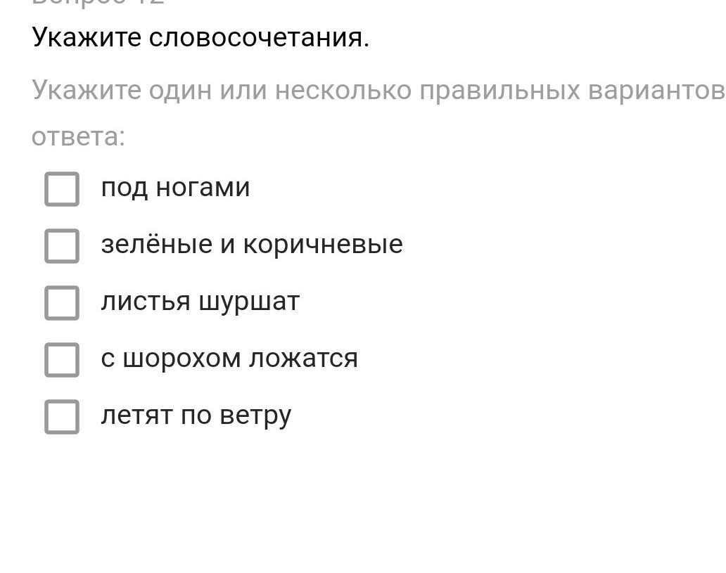 Укажите словосочетания. Укажите один или несколько правильных вариантов ответа: под ногами зелёные и коричневые листья шуршат с шорохом ложатся летят по ветру