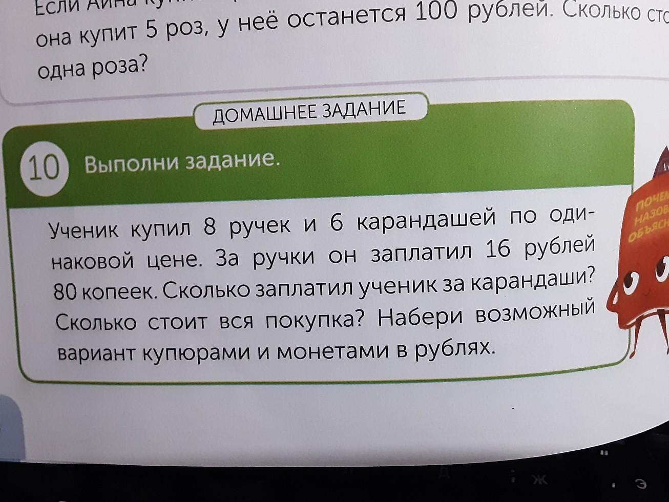 Выполни задания Ученик купил 8 ручки и 6 карандашей по одинаковой цене за ручку он заплатил 16 руб 80 коп сколько заплатила ученица карандашей Сколько стоит вся покупка Набери возможный вариант купюрами и монетами в рублях