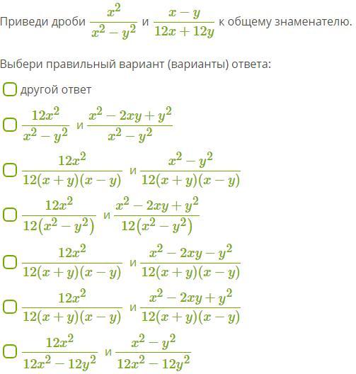 Чтобы получить общий знаменатель дроби, нужно домножить числитель и знаменатель дроби на то, чего не хватает в знаменателе каждой из дробей. В первой дроби не хватает 12, а во второй (x-y)