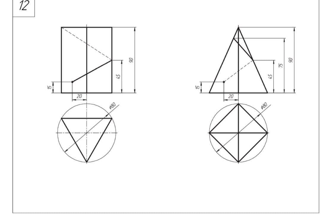 Построить вид слева двух данных деталей. Построить недостающие проекции точек и линий на заданных поверхностях