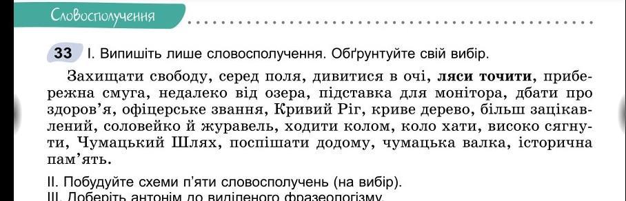 Захищати свободу, дивитися в очі, прибережна смуга, недалеко від озера, ппідставка для монітора, дбати про здоров'я, офіцерське звання, криве дерево, більш зацікавлений, соловейко й журавель, ходити колом, коло хати, високо сягнути, поспішати додому, чумацька валка, історична пам'ять.