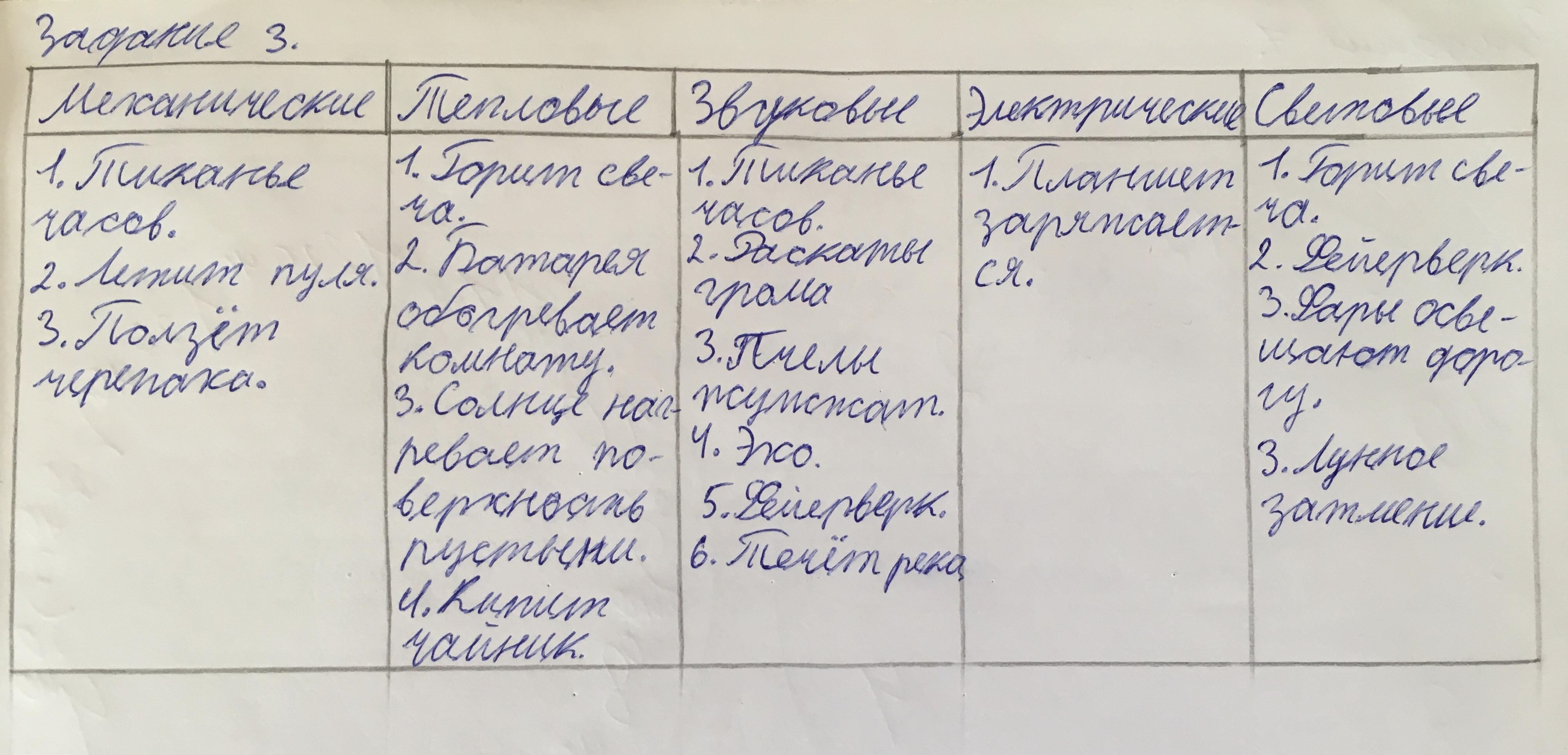 Предлагаемую ниже таблицу расчертите на бланке и аргументированно укажите, в какой столбец (один или несколько) вы впишете следующие явления: тиканье часов, летит пуля, горит свеча, раскаты грома, ползёт черепаха, пчелы жужжат, эхо, планшет заряжается, фейерверк, фары освещают дорогу, батарея обогревает комнату, течёт река, солнце нагревает поверхность пустыни, лунное затмение, кипит чайник.