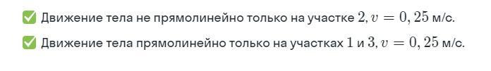 2) Движение тела прямолинейно только на участках 1 и 3,u = 0,25 м/с
