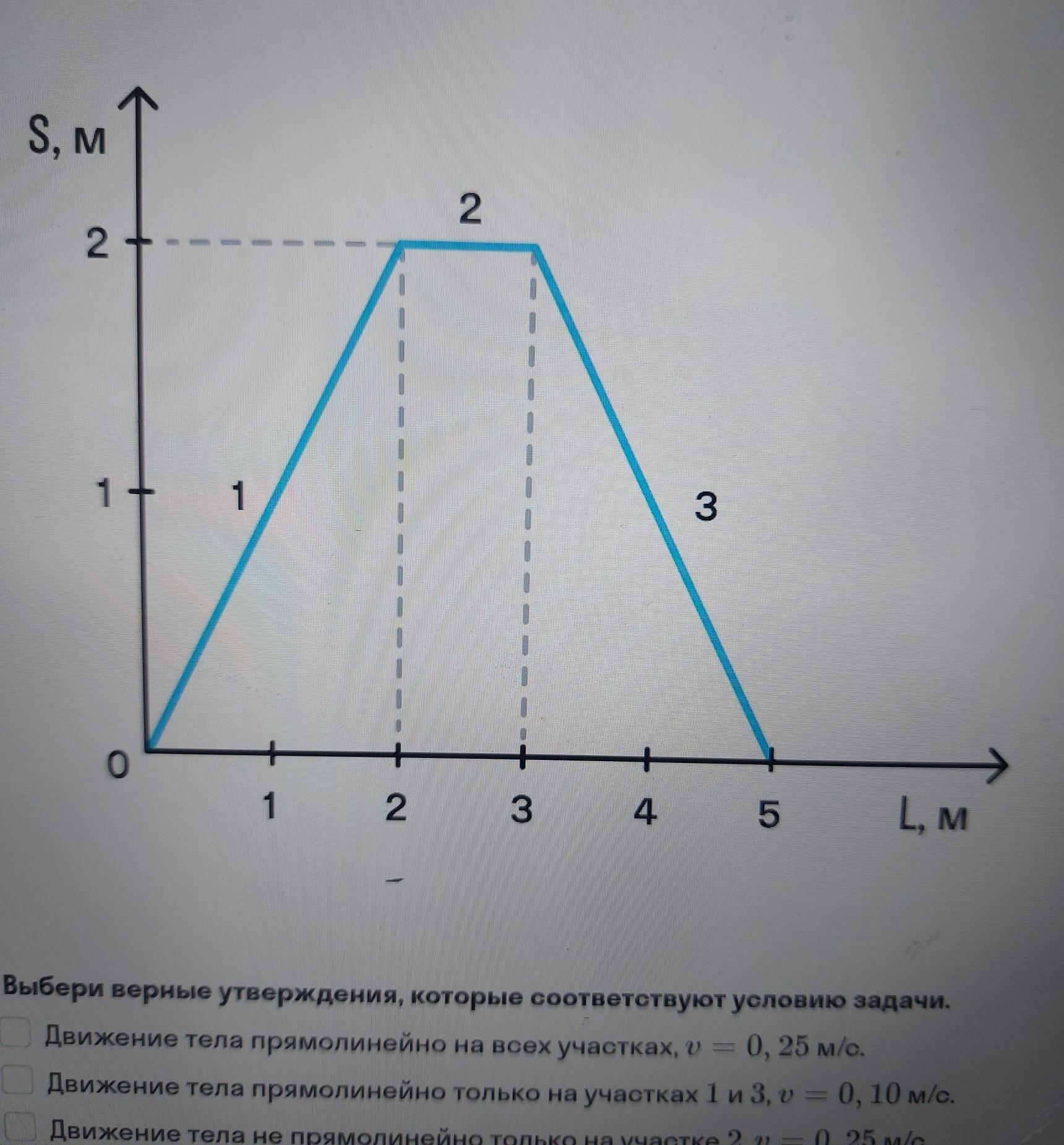 3)Движение тела не прямолинейно только на участке 2,v=0.25 м/с