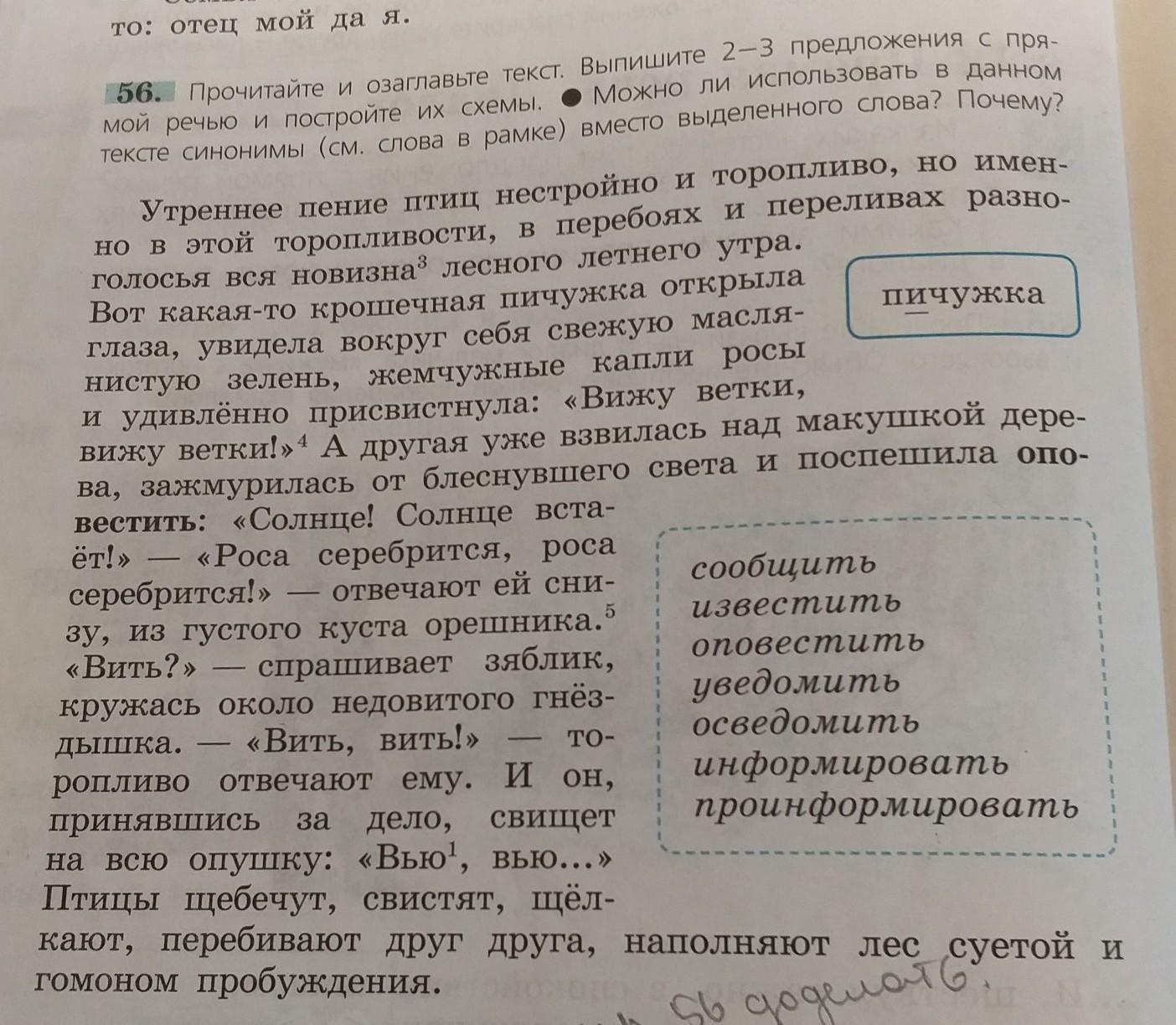 56. Прочитайте и озаглавьте текст. Выпишите 2-3 предложения с пря- мой речью и постройте их схемы. Можно ли использовать в данном тексте синонимы (см. слова в рамке) вместо выделенного слова? Почему?