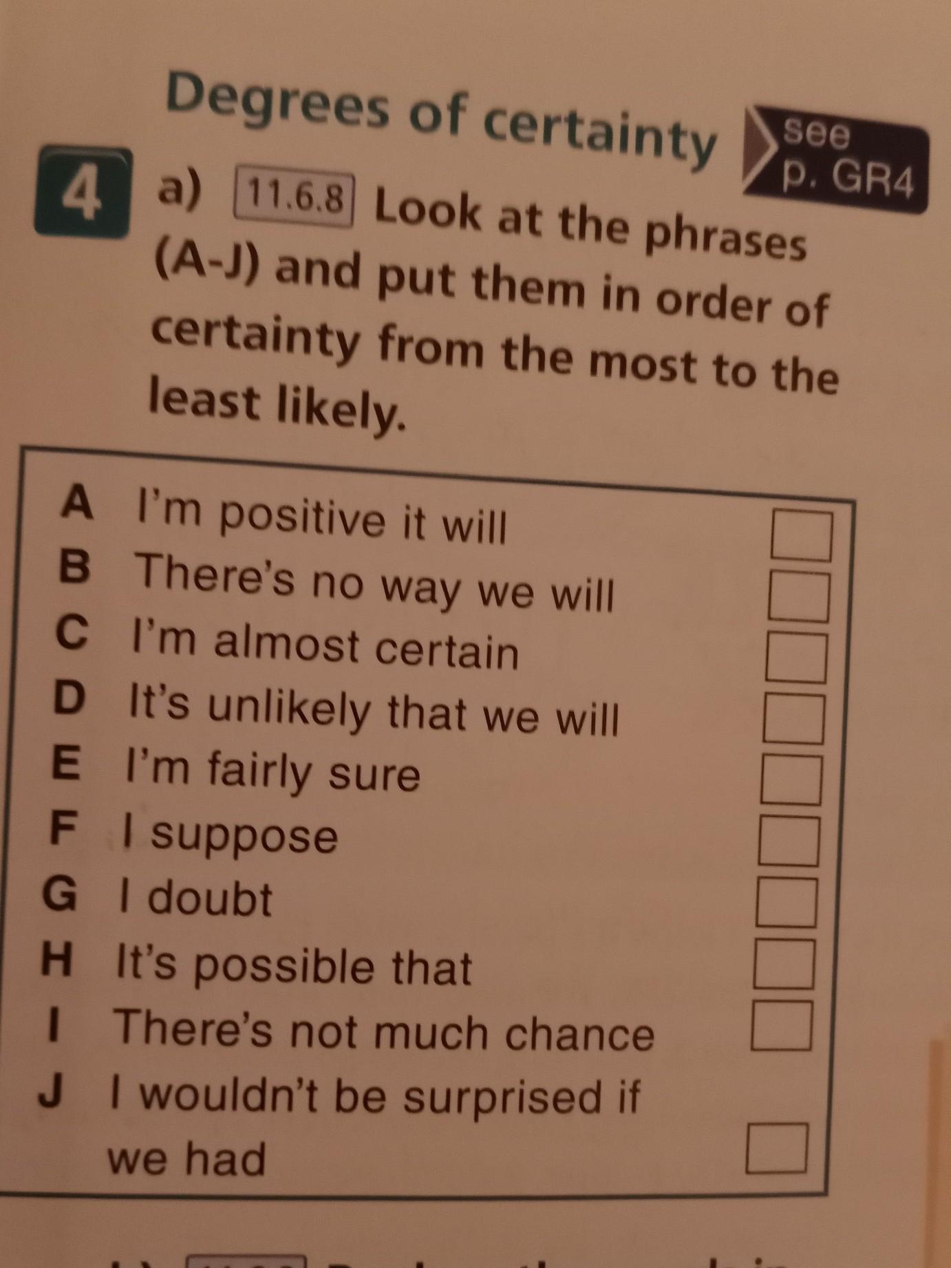 Look at the phrases (a-j) and put them in order of certainty from the most to the least likely.