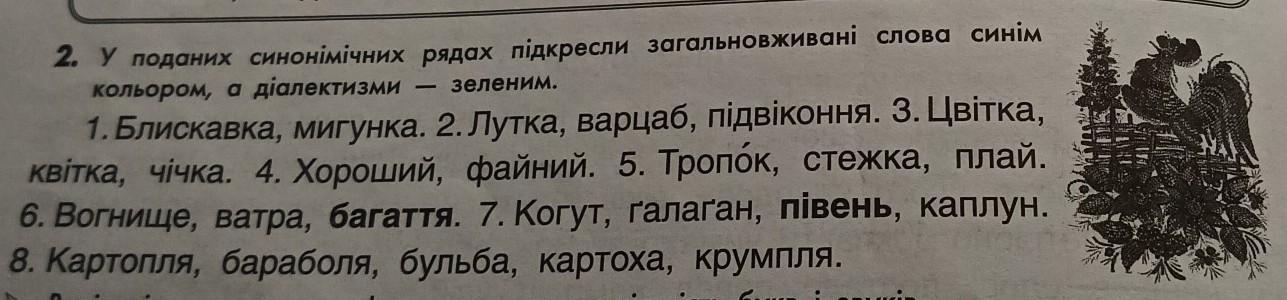 . У поданих синонімічних рядах підкресли загальновживані слова синім кольором, а діалектизми 1. Блискавка, мигунка. 2. Лутка, варцаб, підвіконня. 3. Цвітка, квітка, чічка. 4. Хороший, файний. 5. Тропок, стежка, плай. 6. Вогнище, ватра, багаття. 7. Когут, галаган, півень, каплун. 8. Картопля, бараболя, бульба, картоха, крумпля. ками кількість букв і звуків. D,