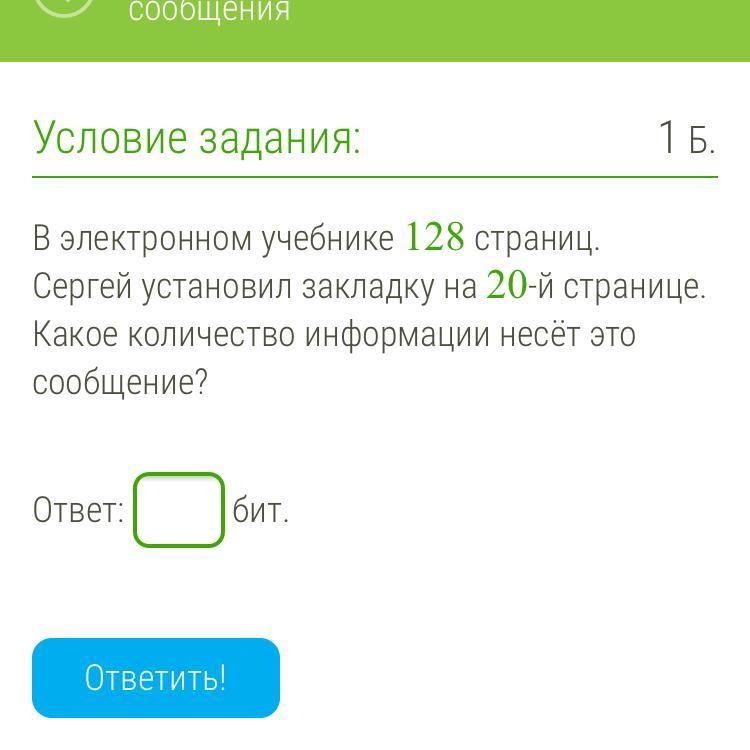 В электронном учебнике 128 страниц. Сергей установил закладу на 20-й странице. Какое количество информации несёт сообщение?