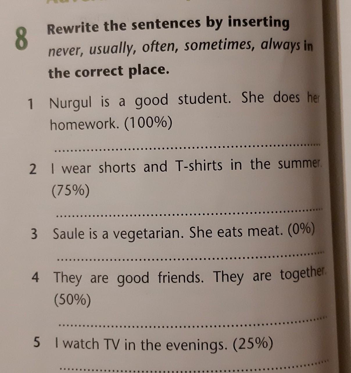 Rewrite the sentences by inserting never, usually, often, sometimes, always in the correct place.