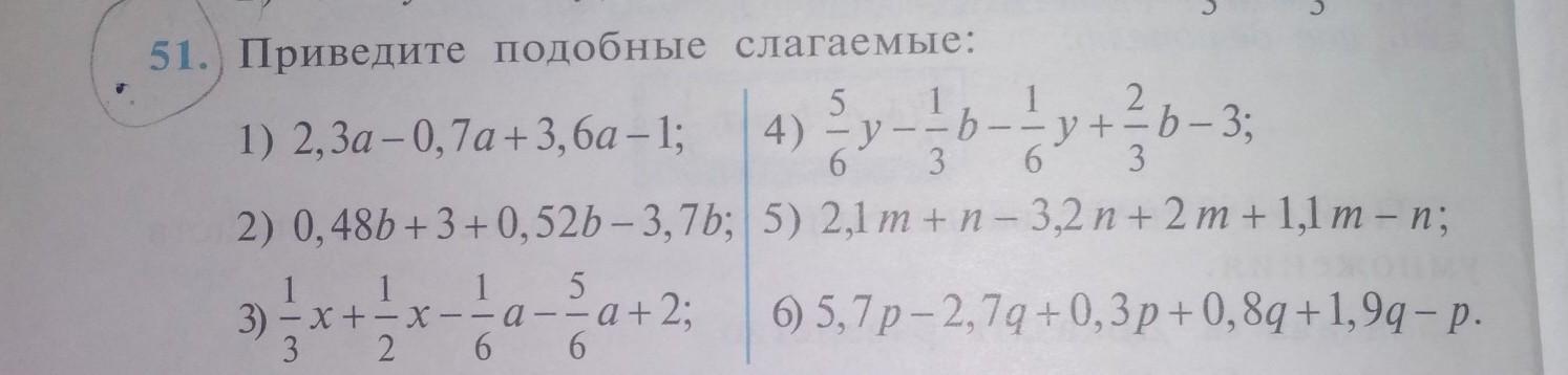 3 3 51. Приведите подобные слагаемые: 1) 2, 3а - 0, 7а + 3, 6а - 1; 2) 0,48b+ 3 +0,52b-3,7b; 5) 2,1 m + 1 - 3,2 n + 2 m + 1,1 m-n; 6) 5,7р-2,74 +0,3р +0,8q + 1,9-р 1 a 6 а + 2; вопрос на фоте здесь ошибкой написана.