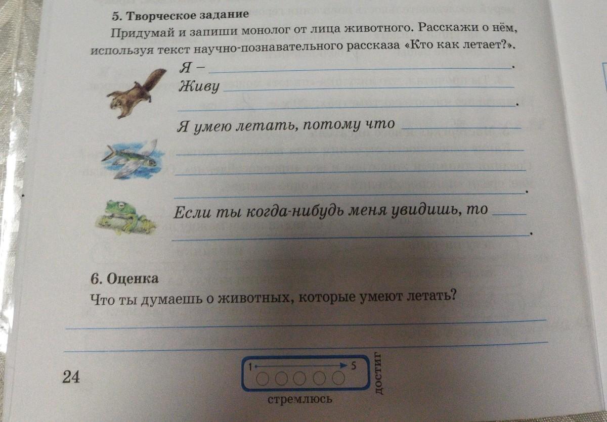 творческое задание Придумай и запиши монолог от лица животного Расскажи о нём Используя текст научно-познавательного рассказа Кто как летает белка-летяга Я живу. рыба летучих Я умею летать потому что. и лягушка Пилот Если ты когда-нибудь меня увидишь то. срочноооооо!!!!!!! если честно на третий класс