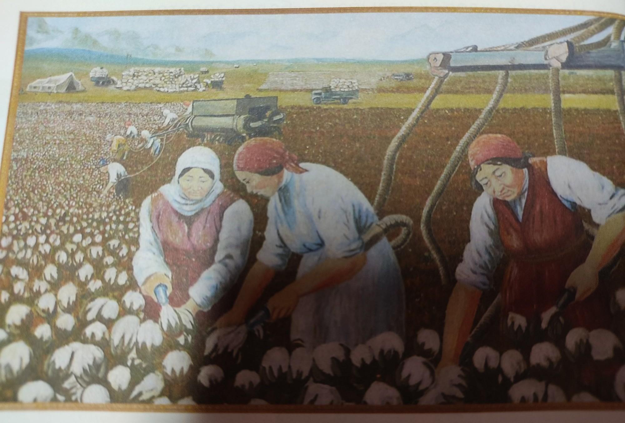 Картина называется Сбор хлопка. Её написал Абылхан Кастеев. На дальнем плане изображены машины которые возят хлопок. Хлопок растёт в южных местах. На переднем плане картины изображены люди которые собирают хлопок. Художник изобразил из в тёмных тонах и трудолюбивыми. В уборке хлопка людям помогают грузовые машины и комбайны. Труд хлопкоробов очень важный потому что они обеспечивают людям вещи. Абылхан Кастеев использовал холодные тона. Они помогают передать большой труд людей. Смотря на эту картину я испытываю чувства жалости перед этими трудолюбивыми людьми. Мне очень понравилась картина.