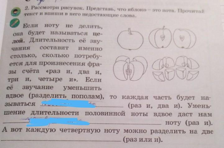 2. Рассмотри рисунок. Представь, что яблоко – это нота. Прочитай текст и впии в него недостающие слова. ) (O) (0) Если ноту не делить, она будет называться це- лой. Длительность её зву- чания составит именно столько, сколько потребу- ется для произнесения фра- зы счёта «раз и, два и, трии, четыре и». Если eë звучание уменьшить вдвое (разделить пополам), то каждая часть будет на- зываться (раз и, два и). Умень- шение длительности половинной ноты вдвое даст нам ноту (раз и). А вот каждую четвертную ноту можно разделить на две (раз или и).