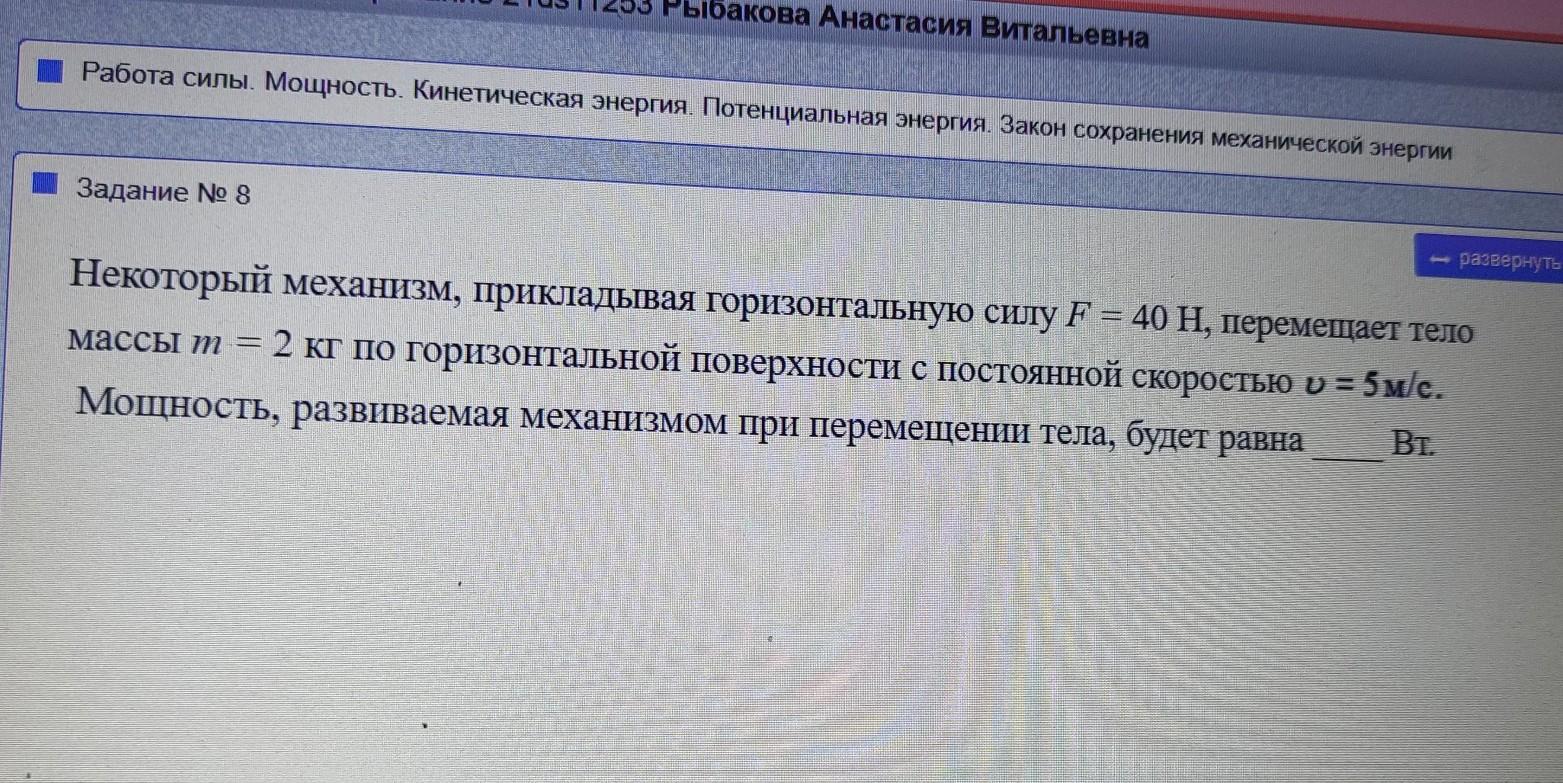Некоторый механизм, прикладывая горизонтальную силу F = 40 Н, перемещает тело массы m = 2 кг по горизонтальной поверхности с постоянной скоростью U = 5 м/с. Мощность, развиваемая механизмом при перемещении тела, будет равна Вт.