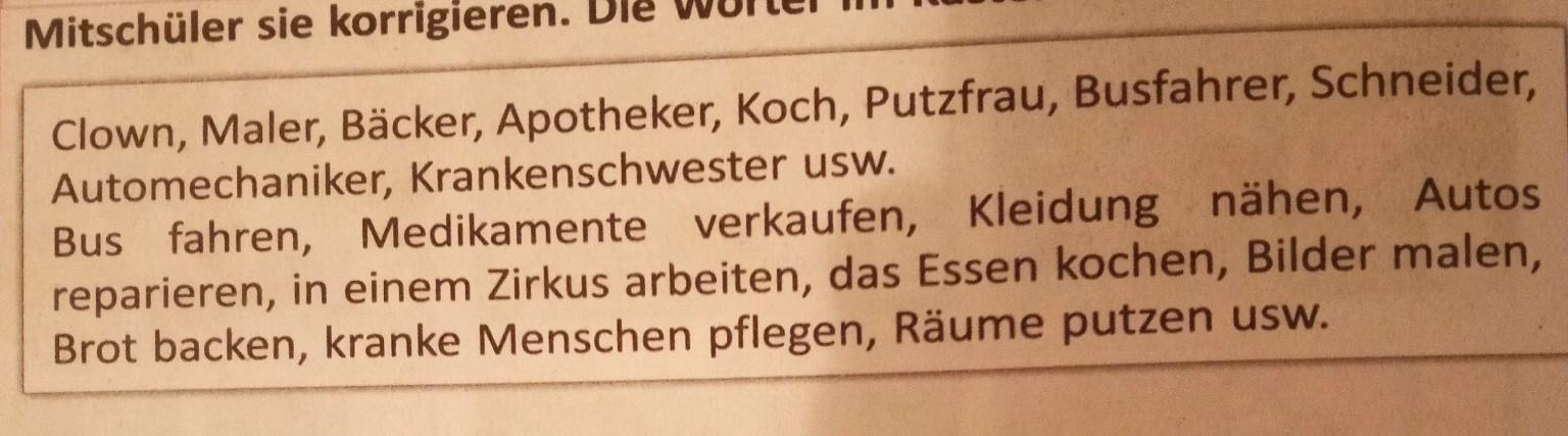 клоун, художник, пекарь, фармацевт, повар, уборщица, водитель автобуса, портной,