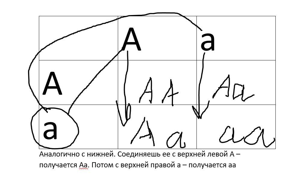 Делаешь короче вот такую табличку, как на первом скрине, это мы записали 2 этих генотипа Аа и Аа.